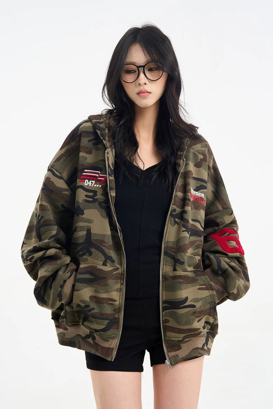 Kurz geschnittene Camo-Sweatjacke mit flauschiger Kapuze
